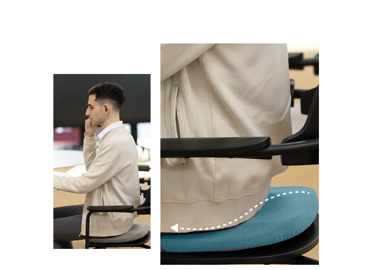 다재 의자는 좌판 틸팅으로 경척추의 바른 균형을 만들어줍니다.
