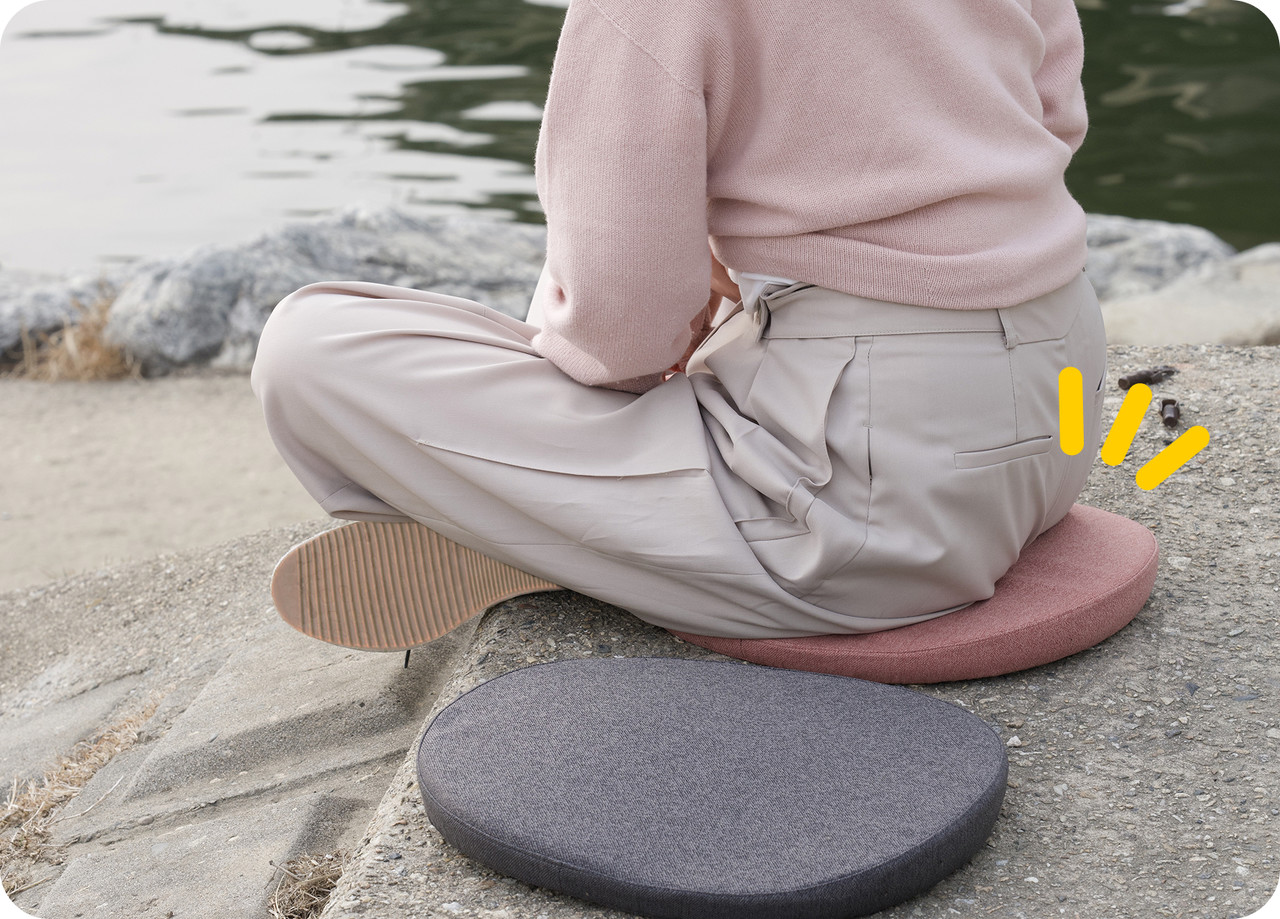사용 용도에 따라 앞뒤로 돌려 바른 자세를 만들어주는 휴대용 쿠션입니다. 집, 사무실을 넘어 공원이나 자동차에서도 바른 자세로 건강한 라이프스타일을 만들어보세요.